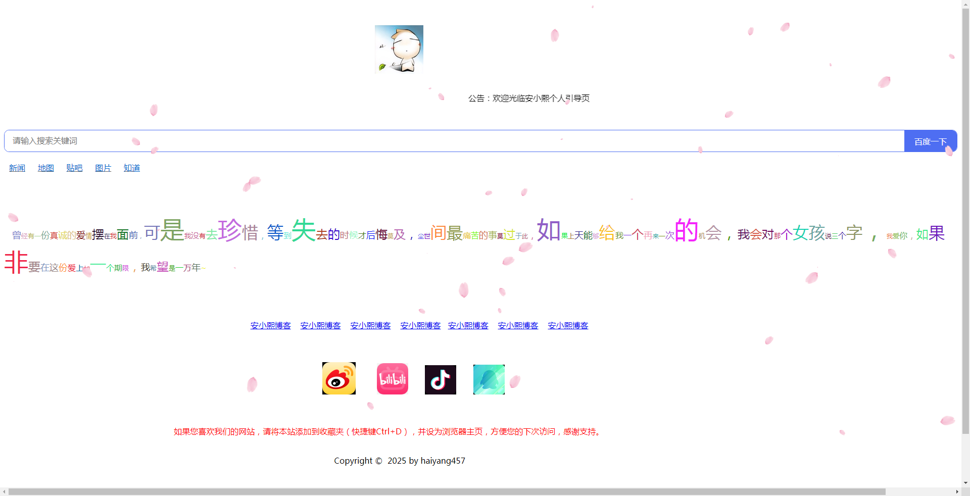 功能:含有公告、百度搜索、鼠标点击弹出爱心、樱花特效、访客统计。