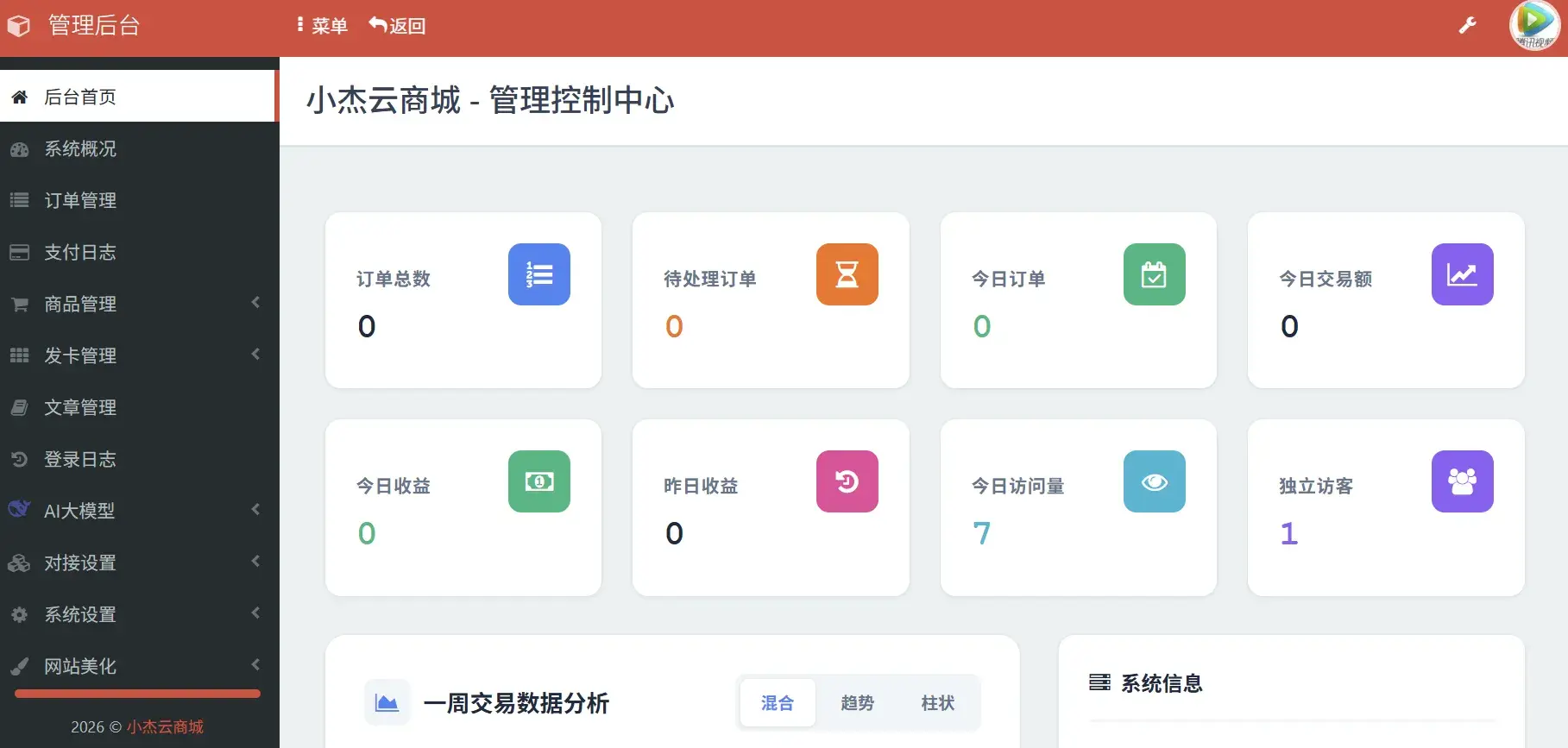 后台管理一目了然- 优惠券、IP黑名单、用户转账应有尽有- 支持订单、分站相关功能,想怎么玩就怎么玩- 支持指定地区加价,不同区域灵活定价- 支持商品介绍替换,一键修改超方便- 支持商品动态发布,前台直接展示,互动拉满- 独立充值返利系统,自动返利,留住用户超简单- 内置Deepseek AI对话助手,智能交互直接拉满 重点来了!安全与颜值直接拉满!图片上传逻辑全面严格限制,伪图片、危险文件彻底拦截,安全拉满,放心开站不怕被搞!全站超级美化:前台界面美化、鼠标美化、后台侧边栏框架美化、全局字体美化、页面背景美化,一整套用起来颜值爆表、手感丝滑! 全套系统完全开源!无任何隐藏!